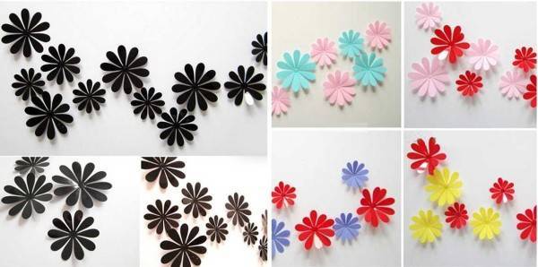 По тому же принципу делают и цветы из такой же двусторонней цветной бумаги. Причем простые ромашки смотрятся как украшение более графично, чем более сложные (маки, розы и т.д.). Вырезав их, лепестки слегка загибают, липучку приклеивают к серединке. Получается объемное украшение.