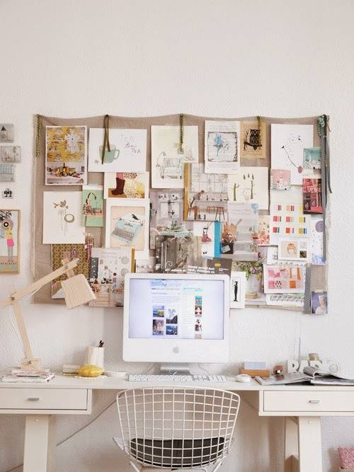 Прекрасным украшение стены в рабочей зоне станет доска, на которой можно смело размещать объявления, важные заметки и напоминания.