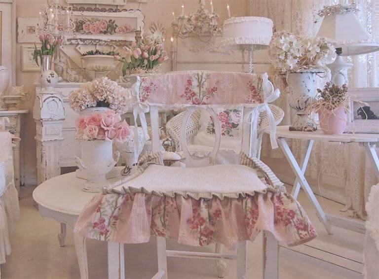 Интерьер, оформленный в таком стиле, требует использования всевозможных женских вещиц, расписанных цветами. Чаще всего это розочки, они уместно будут выглядеть как в текстиле, так и в виде аппликации на стену. Не обходится этот стиль и без мебели с цветочным декупажем.
