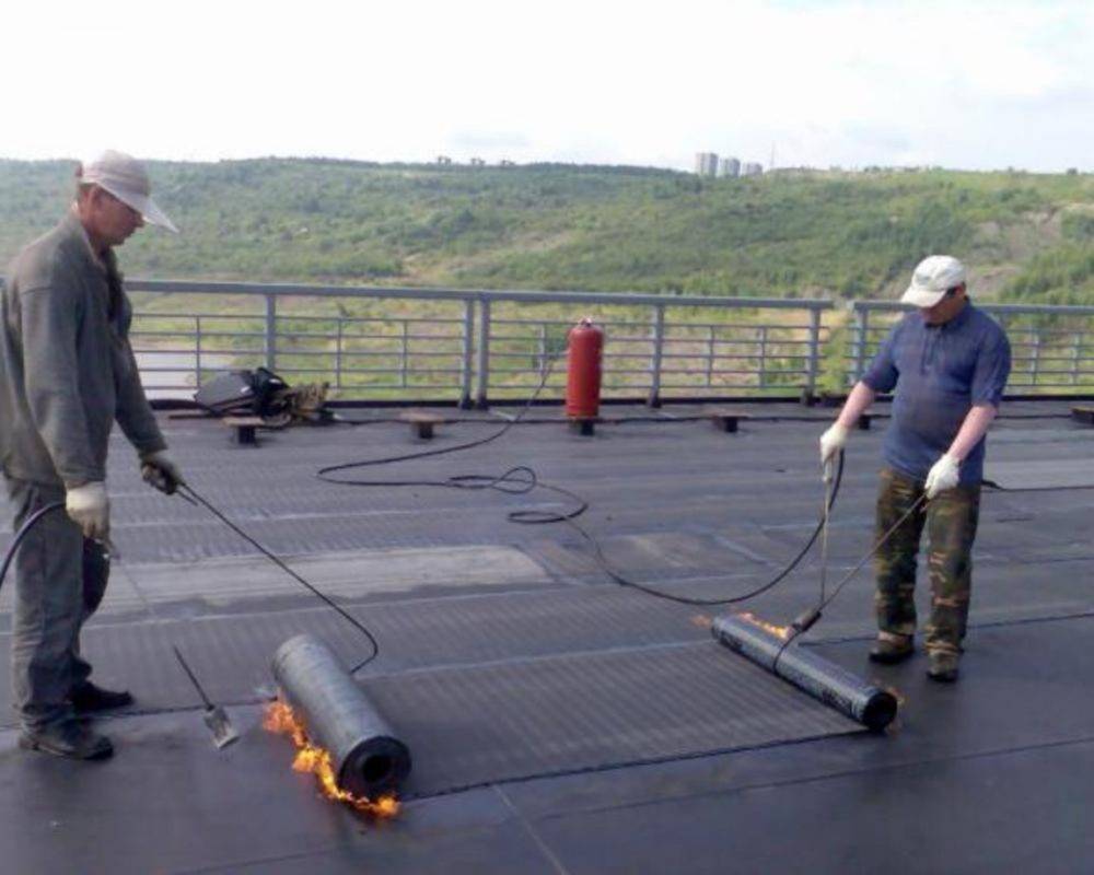 Для проведения работ требуется присутствие двух работников: один нагревает кровельное покрытие и раскатывает его кочергой, второй руками разравнивает и слегка прижимает.