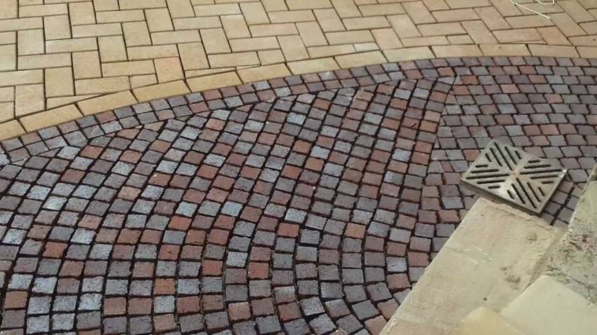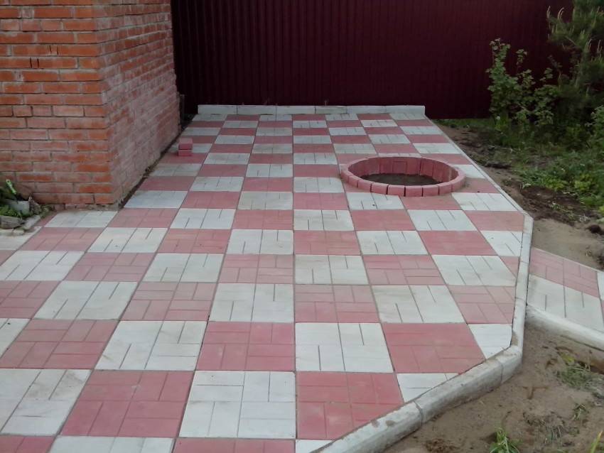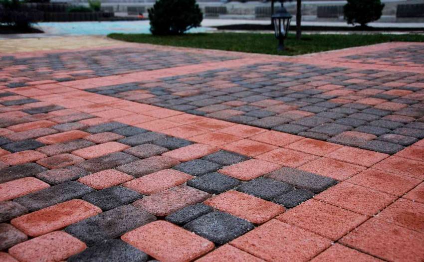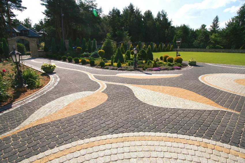 Очень стильно смотрится укладка двух цветов брусчатки в шахматном порядке. Оригинальным будет круговой дизайн, здесь также можно экспериментировать с цветами, используя два или более оттенков тротуарной плитки.