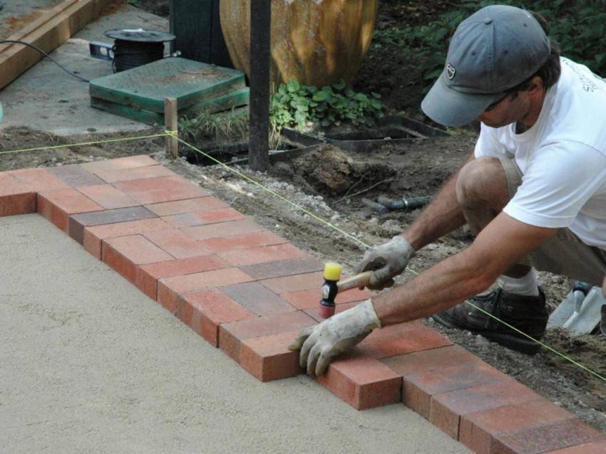 Теперь можно приступить к мощению тротуарной дорожки или площадки. Плитку стоить укладывать «от себя», немного вдавливая в основание, выравнивать с помощью резинового молотка.