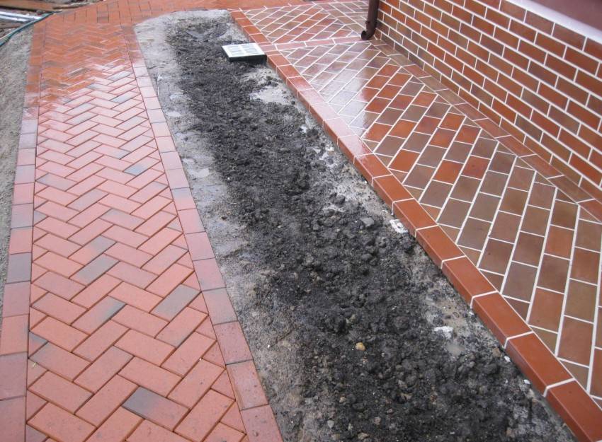 По периметру будущей дорожки своими руками делается траншея для установки бордюров. Можно воспользоваться брусчаткой более крупного размера либо готовым материалом.