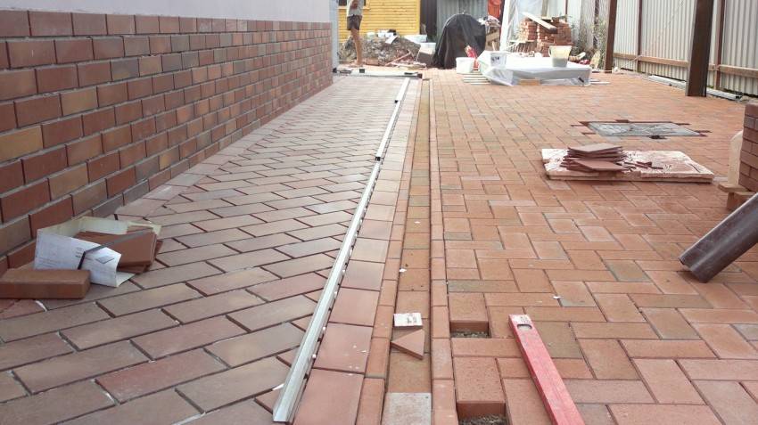 При укладке плитки на бетонное основание установку бордюров можно совместить по времени с заливкой стяжки или проводить эту работу уже непосредственно перед мощением.