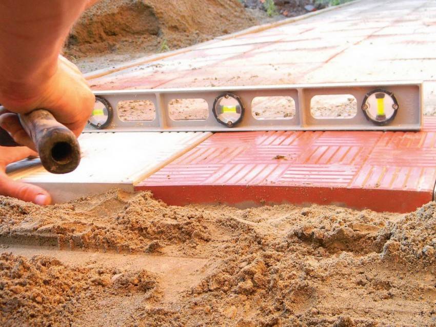 Что касается кладки на песок и цемент, то используется сухая перемешанная смесь. Толщина подсыпки достигает до 150 мм. Высыпать цементно-песчаный состав на песок, который предварительно выравнивается по уровню и трамбуется