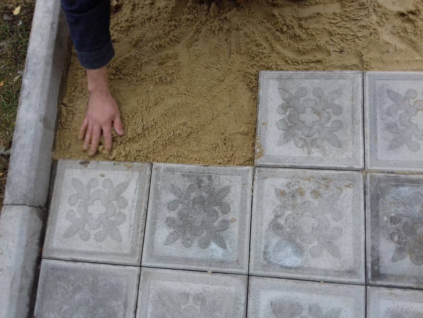 По окончании работы на поверхности рассыпают мелкий песок, и обычным веником начинают потихоньку затирать швы между плиткой.