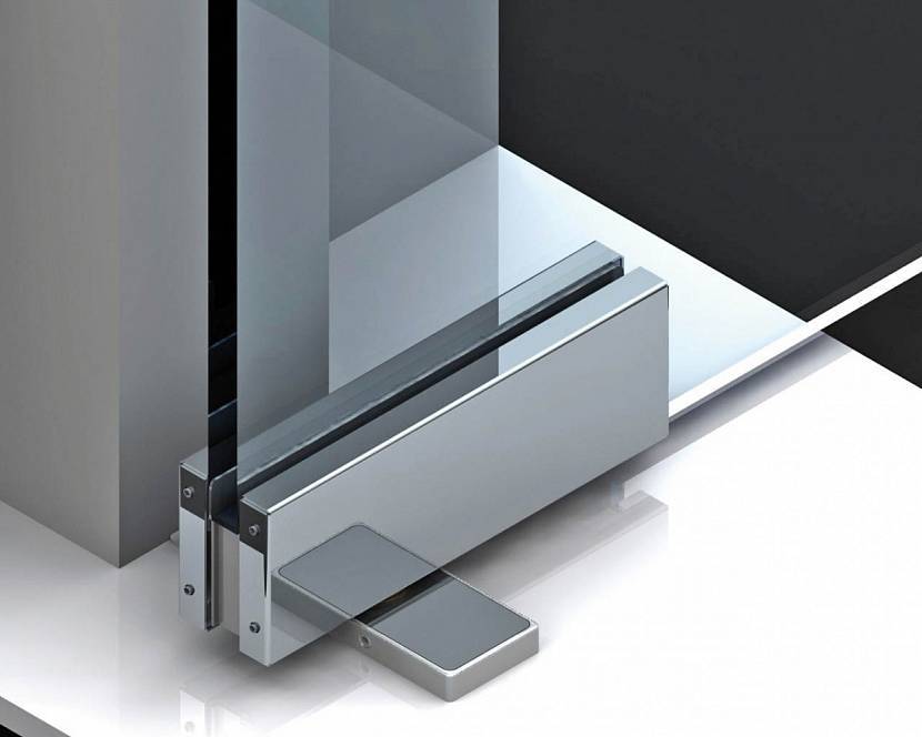 При всей универсальности обеих конструкций, они не подходят для стеклянных дверей, поэтому здесь применяют третий тип доводчиков – напольный. В этом случае корпус с пружиной монтируется в пол таким образом, что сверху видна только пластина-держатель. Такой же держатель крепится и вверху, но механизм там монтируется, только если полотно очень тяжелое.