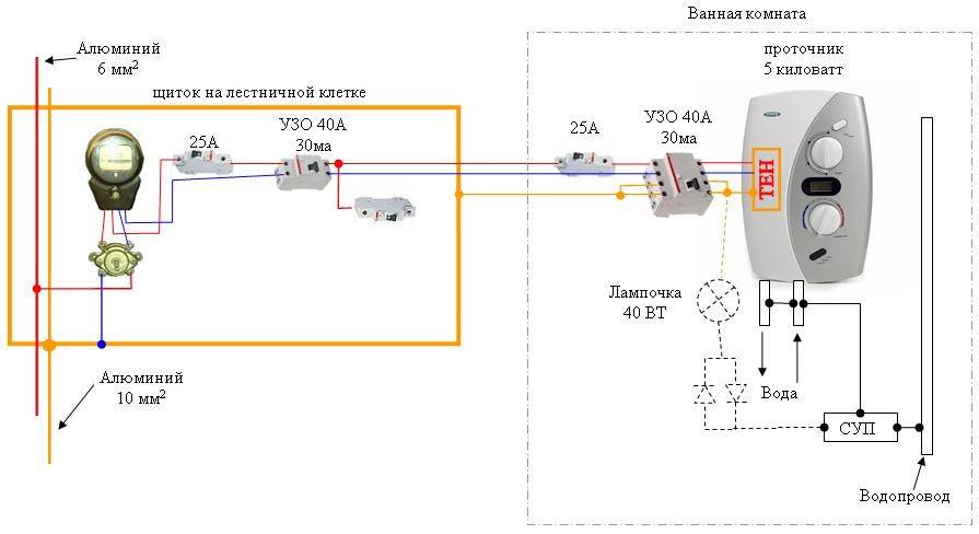 Если планируется использовать мощный нагреватель воды, следует провести к нему отдельный провод с автоматом УЗО.