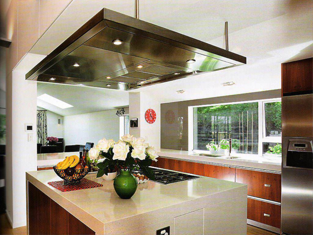 - Островные – оборудование крепят к потолку над газовой плитой, для этого требуется много места. Благодаря наличию мотора высокой мощности устройство справляется с поставленной задачей максимально быстро. Зачастую такие модели устанавливают в центре помещения, эти вытяжки имеют привлекательный внешний вид и высокую стоимость.