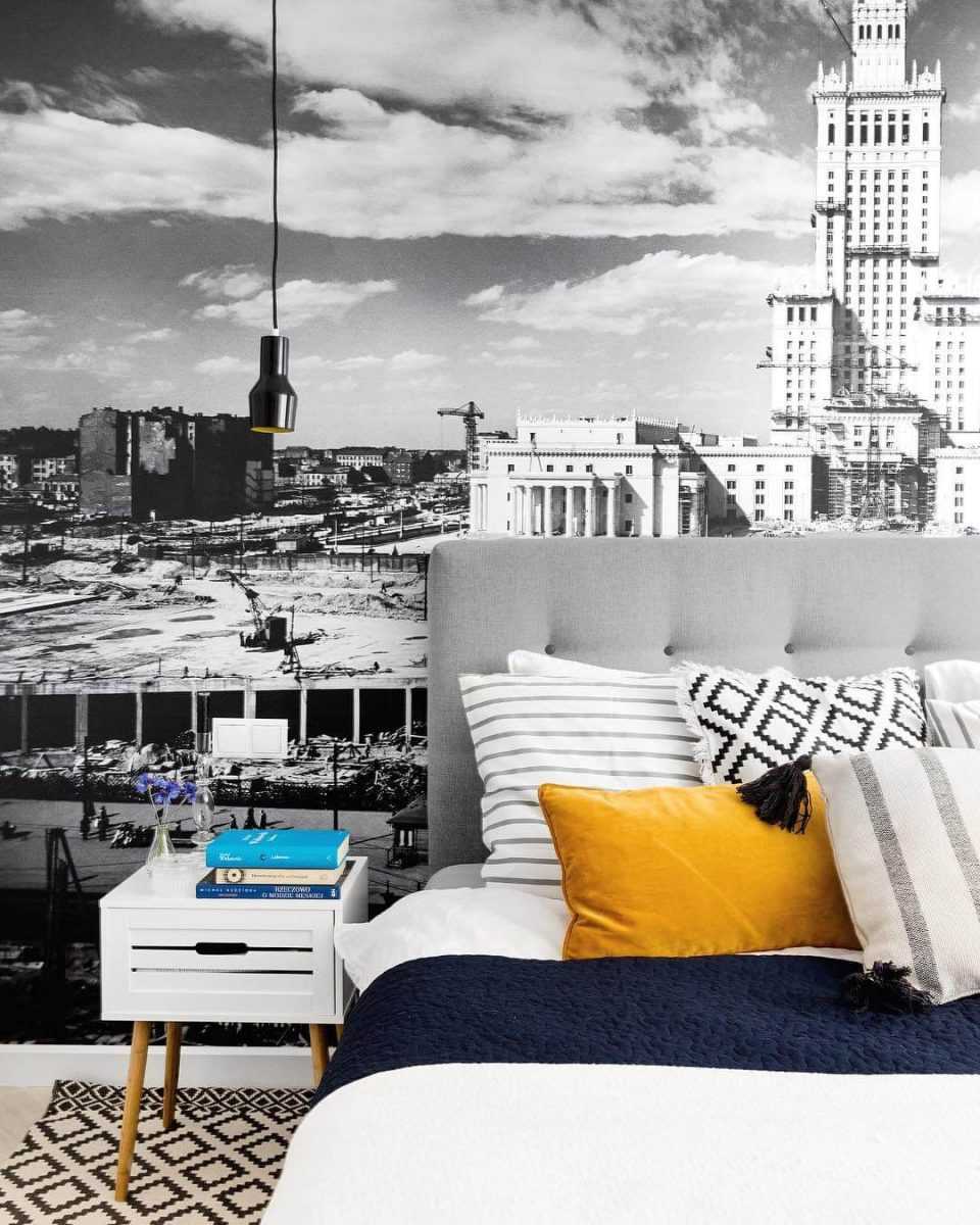 Спросом пользуются и фотообои, изображающие современные мегаполисы. Картины могут быть как с изображением ночного города, так и дневного. Эти варианты привлекают к себе много внимания. Изображение современного мегаполиса лучше всего смотрится в таких стилях как лофт, модерн или современный хай-тек. Чтобы оформить спальню в едином стилистическом ключе, в дополнение к подобным обоям нужно подобрать подходящие светильники и декорации.