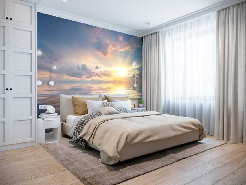 Выделение горизонтов фотообоями над кроватью добавит спальне изящества: