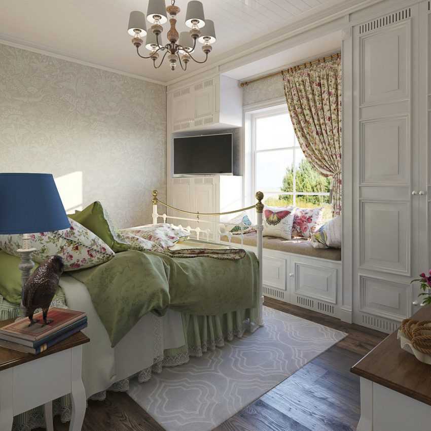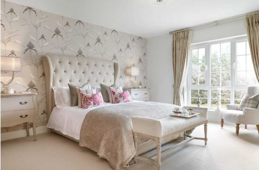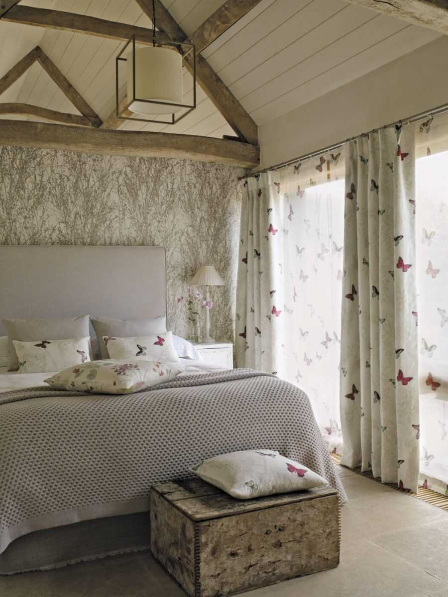 - Романтическая стилистика подходит для или супружеской спальни. Нет ничего сложного в выборе обоев в мелкий цветочек и пошиве штор со сборками и рюшами. Главное – не переборщить с мелким рисунком.