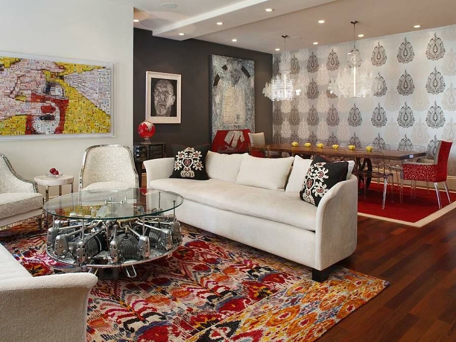 Если ваша гостиная объединена с другими помещениями, например, кухней или столовой, можно обозначить зоны с помощью ковра. Уголок для отдыха уместно выделить половиками с орнаментом или изделиями необычной формы. Для обеденной зоны лучше подобрать варианты в спокойной цветовой гамме.
