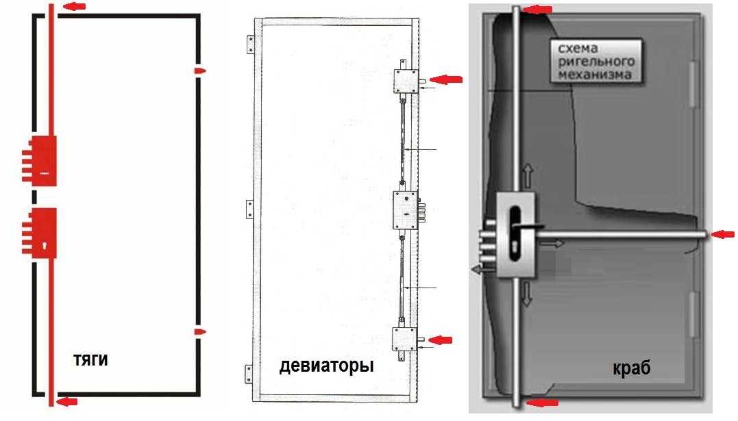 Если при повороте ключа штыри появляются сверху и снизу дверного полотна — это тяги. Если дополнительные штыри выходят в горизонтальной плоскости (обычно в верхней и нижней части с замковой стороны, но могут также быть и с петельной стороны) — это девиаторы. Форма девиаторов может быть любой — в виде круглых штырей или поворотных крюкообразных. Если штыри появляются и снизу/сверху и с петлевой стороны — эта система называется «краб».