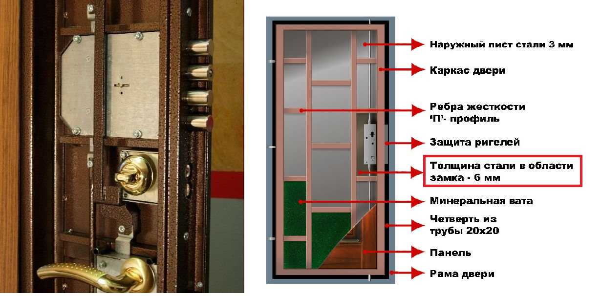 Сами замки, их устройство и надежность можно изучать долго. Но стоит помнить, что в конструкции двери в районе установки замков должна стоять пластина усиления. Толщина стали должна быть, как минимум, в два раза больше, чем в других местах. Если дополнительная накладка сделана из супер-прочной марки стали (марганцовистой) — это дополнительный плюс к тому, чтобы выбрать именно эту металлическую дверь.