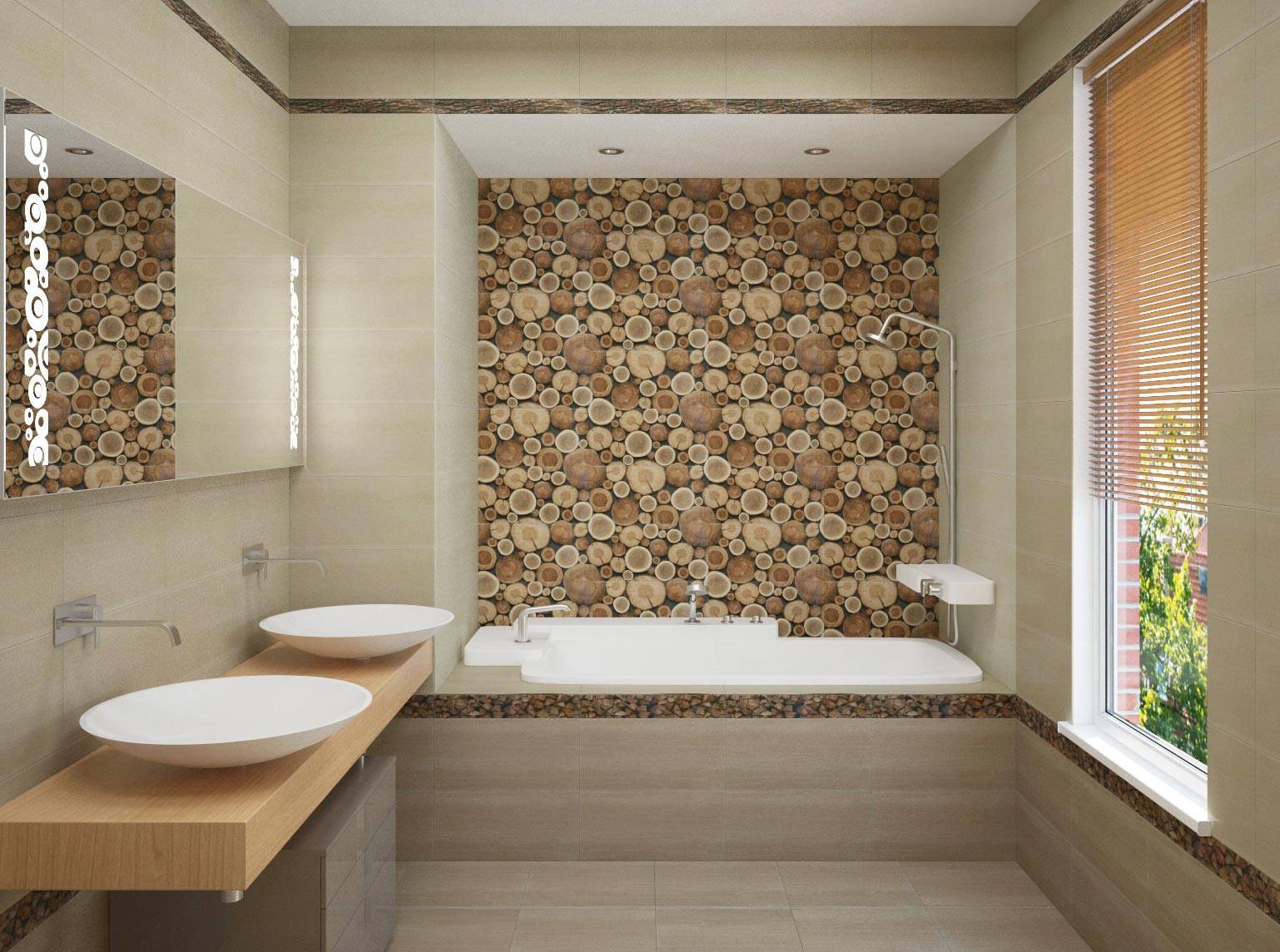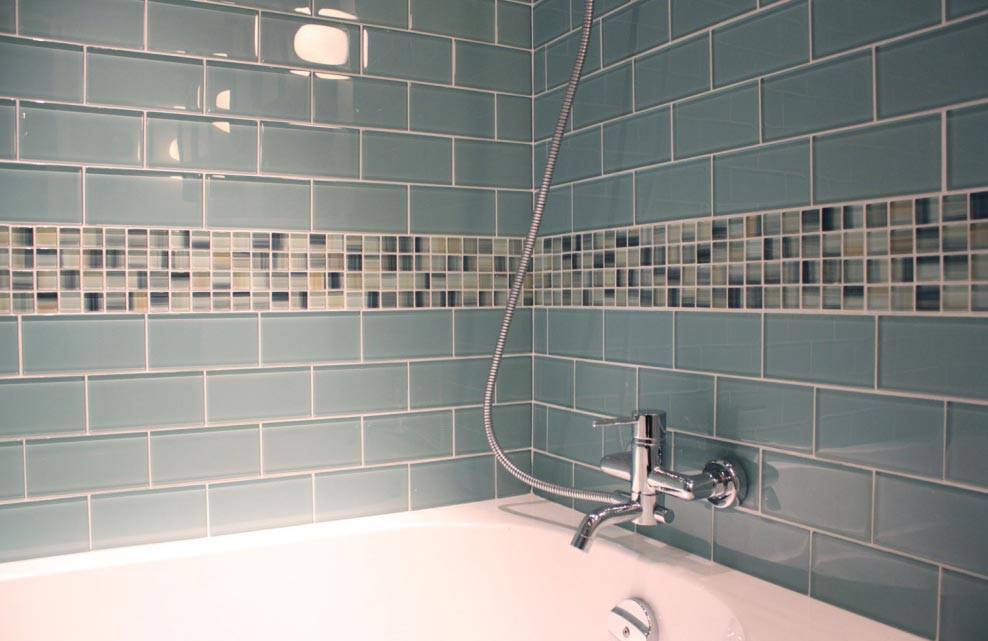 Вставки из стекла позволяют зрительно увеличить небольшие ванные. Плиты могут укладываться по диагонали, «шахматкой». Отделка стены может быть сплошной или комбинироваться с монохромным кафелем. Материал долговечен, прост в очистке, устойчив к коррозии и плесени.