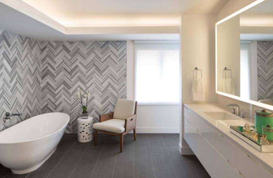 Раскладка «елочкой» используется в оформлении напольных поверхностей, но не рекомендована для стен. Для ванной подбирают керамогранит либо керамику с отделкой под древесину, каменные породы либо однотонные покрытия.