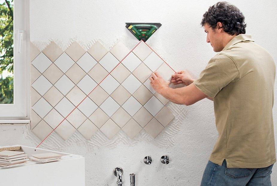 Укладку плитки в ванной следует поручить профессионалам, благодаря чему плитка будет равномерно уложена. Если такой возможности нет, начинайте установку отделочных элементов с правильной подготовки основания. Стену или пол необходимо выровнять и очистить. Также стоит обезжирить поверхность и избавиться от пыльных материалов в помещении. Для выравнивания стены можно использовать специальную эмульсию или раствор. Затем, прежде чем наклеивать плитку, отметьте отвес и выровняйте веревкой или лазерным уровнем. Благодаря этому плитка будет уложена равномерно. Нанося клей на стену, обязательно удалите излишки, так вы избежите появления неприглядных пятен.