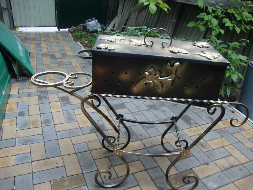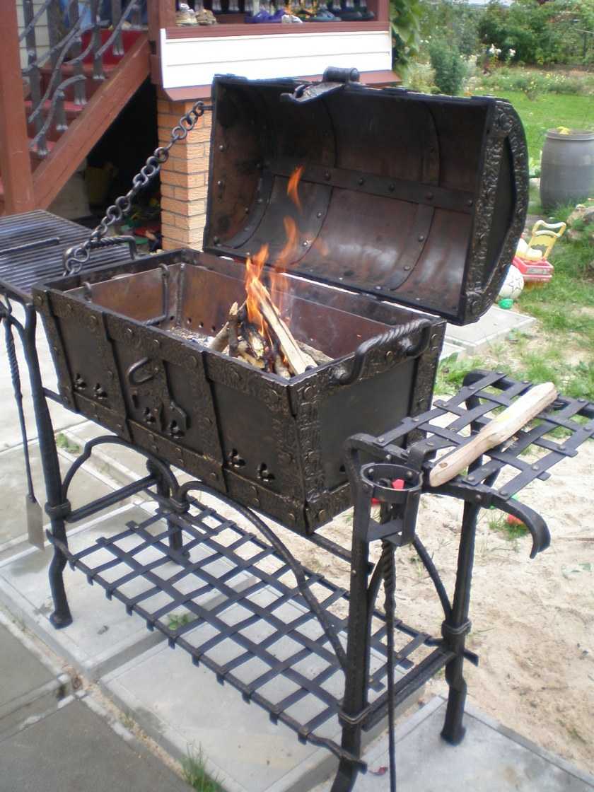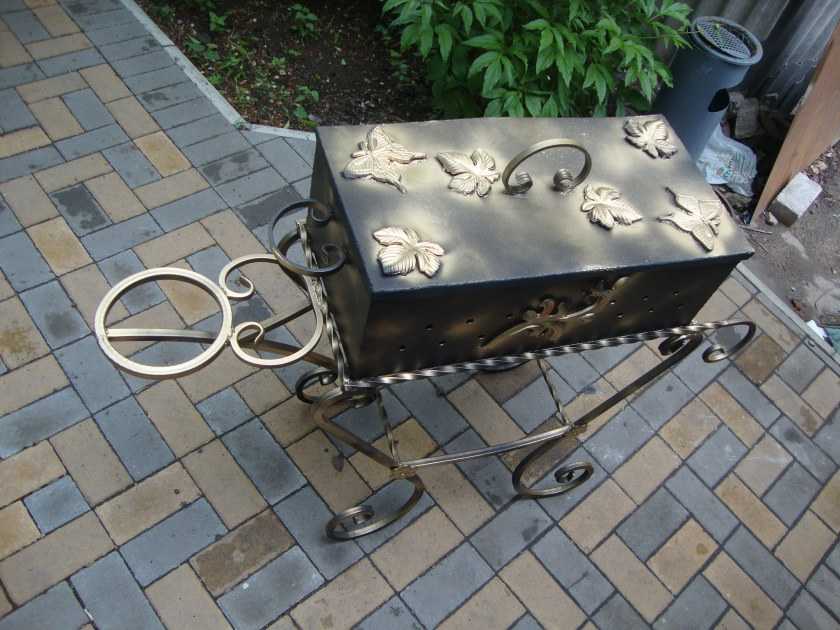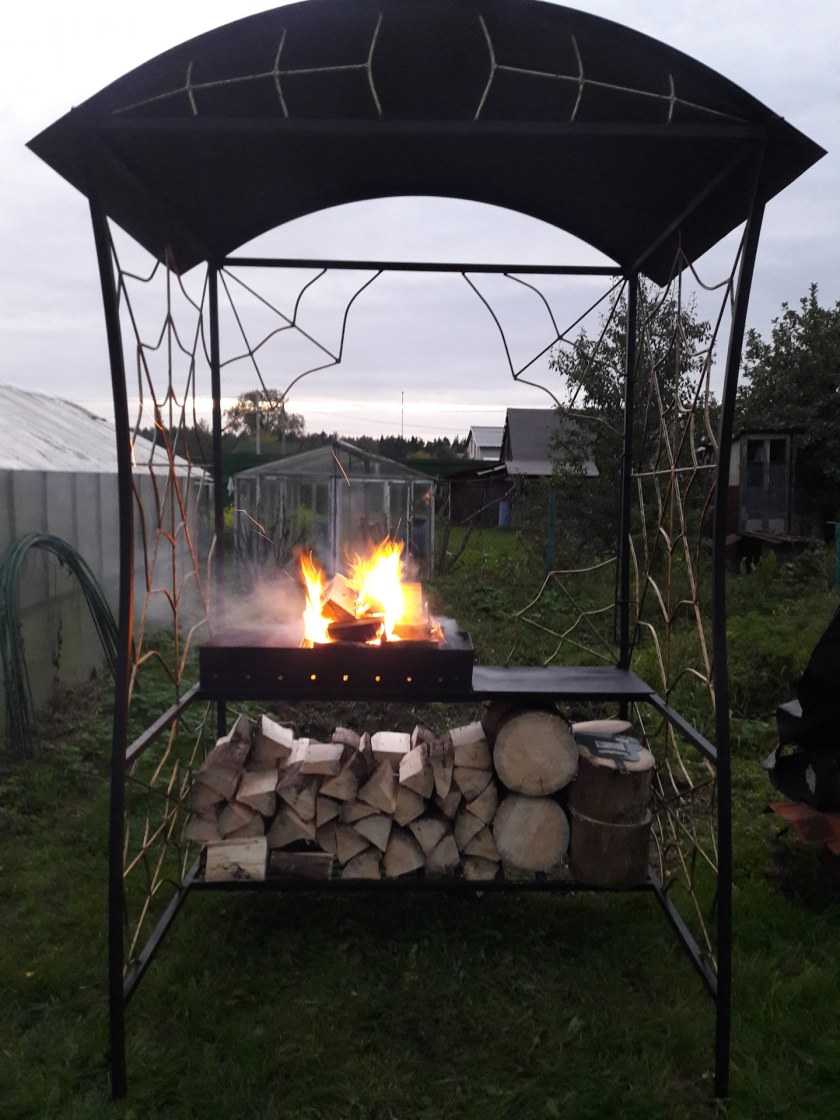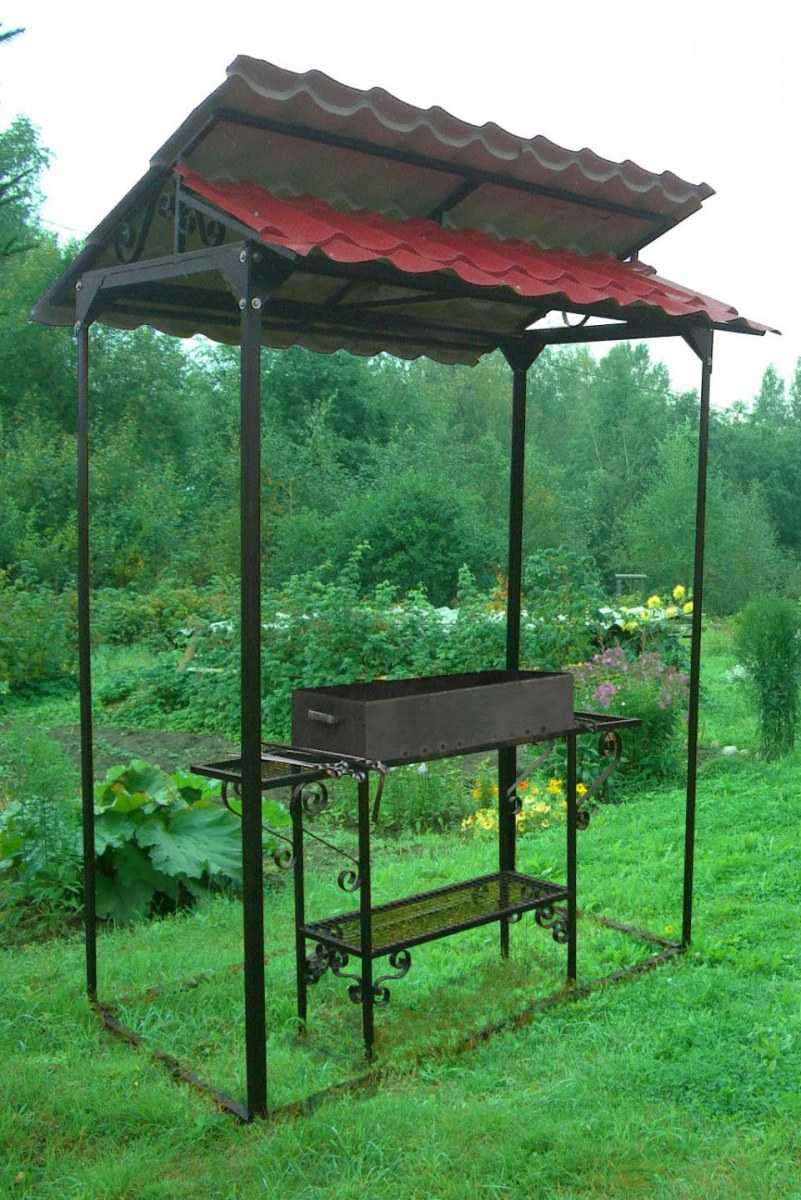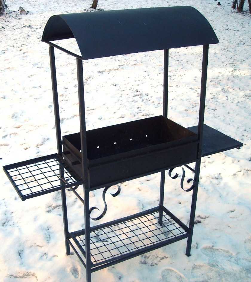 - Стационарная конструкция для дачного участка может быть украшена кованными элементами, быть выполнена из толстой стали. Оснащена навесом, откидными столиками, колесиками.