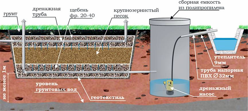 При высоком уровне грунтовых вод инфильтратор для септика размещают как можно выше, а подачу стоков до него организуют с помощью дренажного насоса