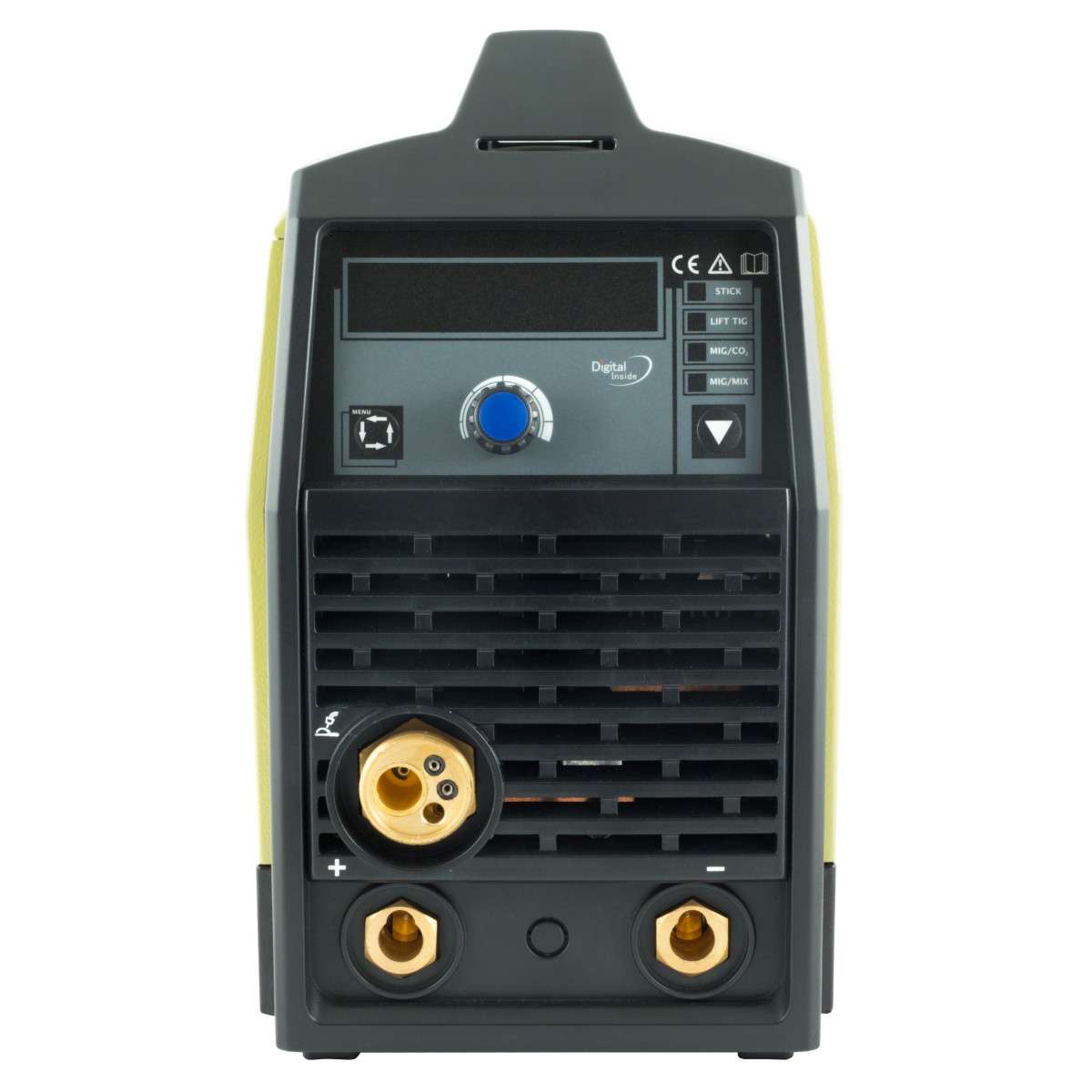 Наиболее универсальный аппарат в обзоре – он позволяет своему хозяину работать как со сварочной проволокой в режиме MIG/MAG, так и со штучными электродами и аргоновой горелкой (правда, исключительно в режиме TIG DC – для сварки алюминиевых сплавов его использовать не получится). Этот инвертор относится к семейству сварочных аппаратов с микропроцессорным синергетическим управлением: он имеет всего два органа управления – сенсорную кнопку выбора режима и многофункциональный регулятор. Большинство параметров горения дуги задается автоматически в зависимости от выбранного режима. Это удобно для новичков, профессиональный же сварщик скорее выберет аппарат с большим количеством ручных настроек. Кроме того, полноценную работу на высоких токах ограничивает низкое значение ПВ: длительно варить электродом можно лишь при его диаметре до 3 мм, что с учетом высокой цены самого инвертора привело к ощутимому снижению балла в рейтинге лучших сварочных аппаратов