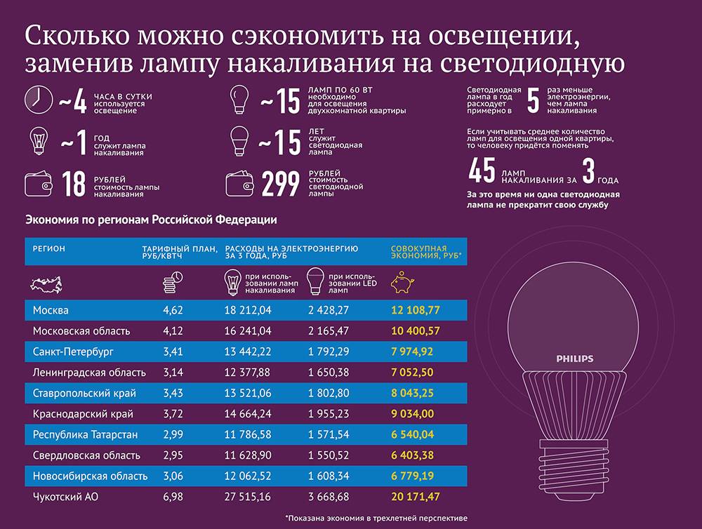 Таблица соответствия энергоэффективности ламп накаливания, энергосберегающих светодиодных и люминесцентных ламп