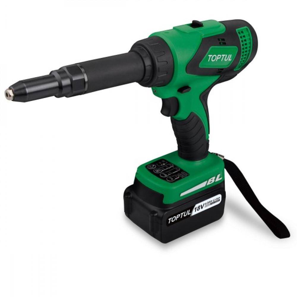 | Аккумуляторный или электрический | Энергия данного вида заклепочника направлена на удар и формирование заклепки. Внешний вид сходен с пистолетом, так как на корпусе есть кнопка. выполненная в виде курка, и работает от сети или батареи АКБ | |
