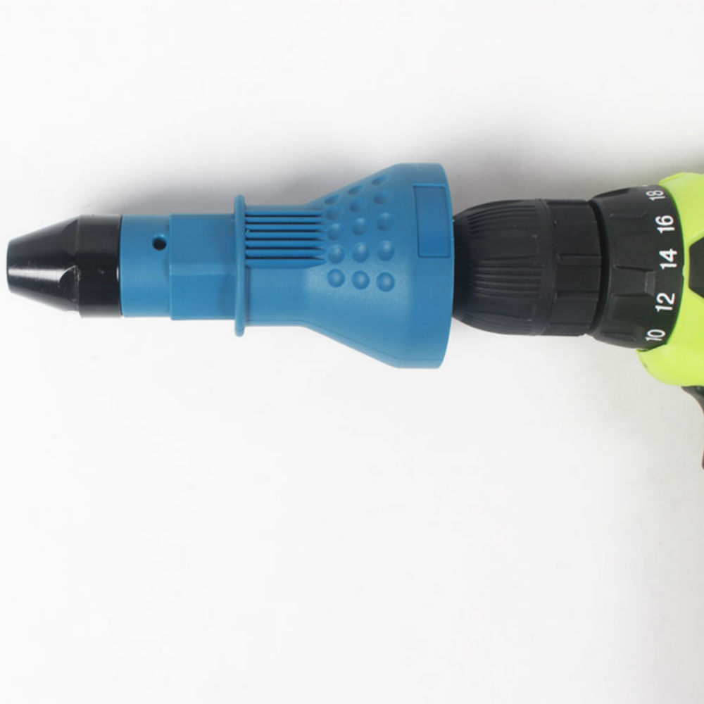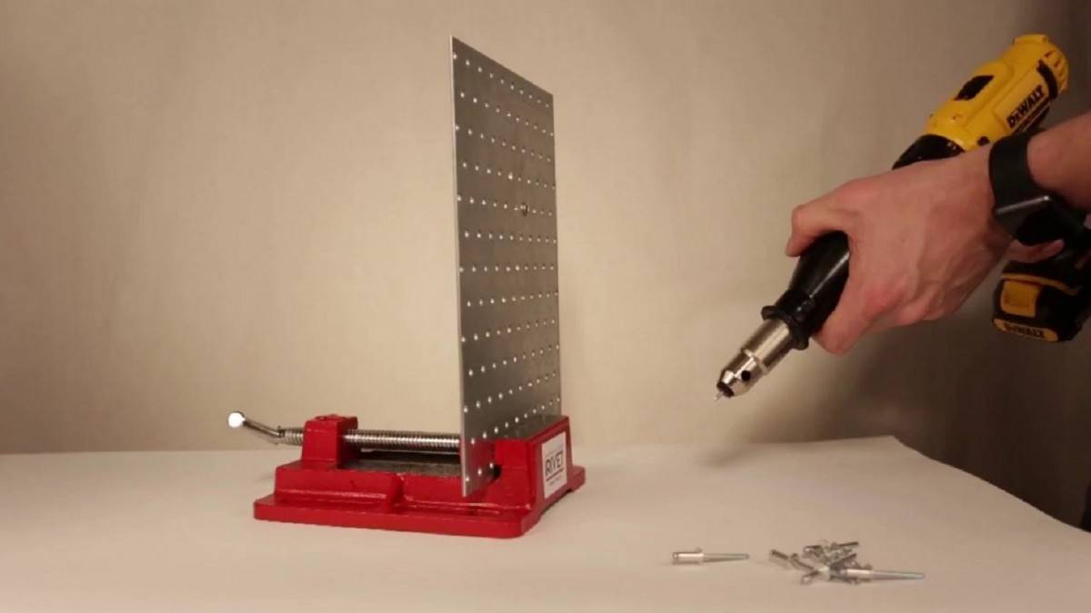 При большом фронте работ с использованием ручных заклепочников, руки очень устают. Конечно, есть аккумуляторные, но цена на них совсем не радует. А если еще и использование — только изредка, покупать электроинструмент нецелесообразно. В этом случае можно пойти на компромисс — приобрести насадку на дрель или шуруповерт для установки заклепок.