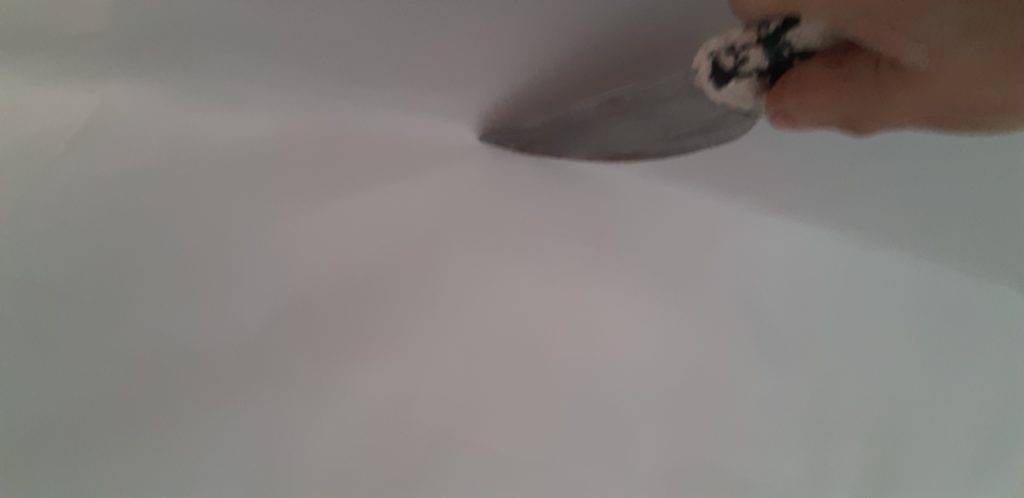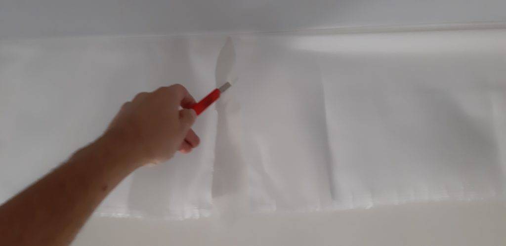 Не беда если с первого раза не получится натянуть ткань без складок. Всегда можно вытащить полотно из замка профиля и заправить его обратно. Для этого в замок вставляем шпатель и прокатывая его вытягиваем ткань. Но не стоит этим слишком сильно увлекаться, потому как замок на профиле не бесконечен.