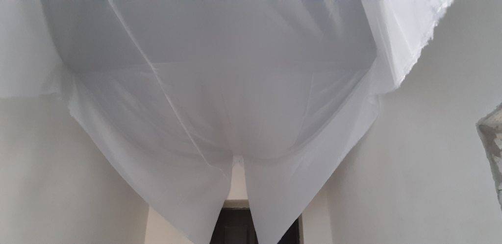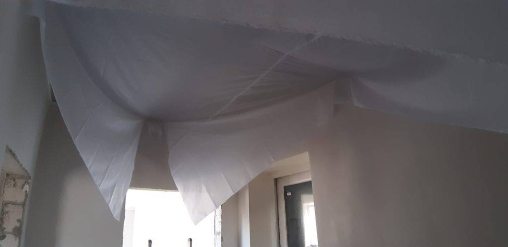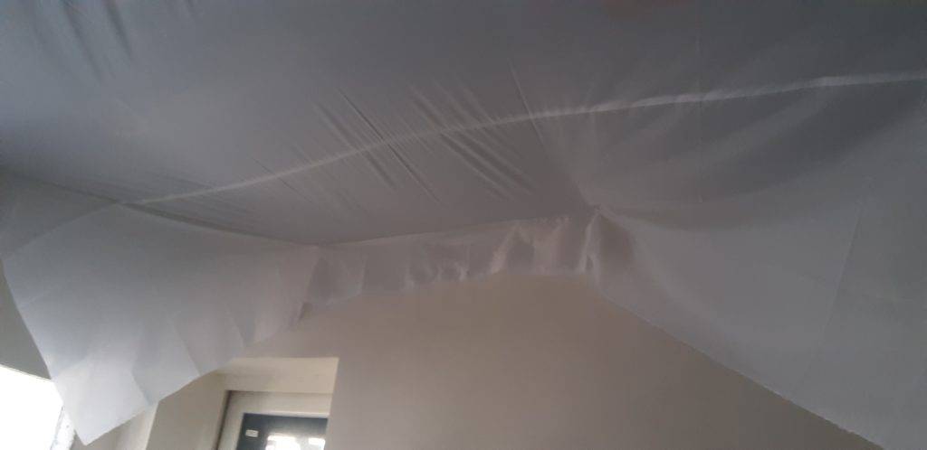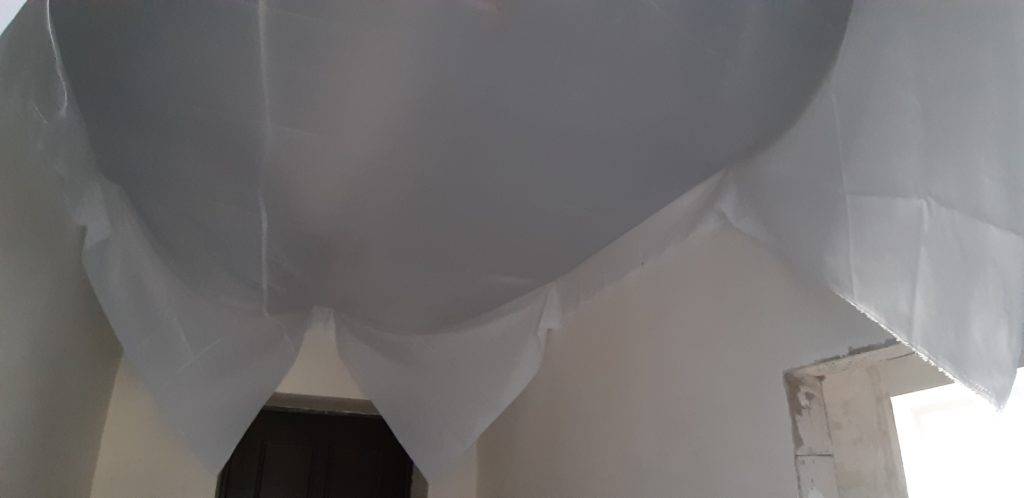 Влажная уборка не проводится на тканевых натяжных потолках. Вода может оставить на поверхности пятна и разводы, устранить которые можно будет лишь путём окрашивания.