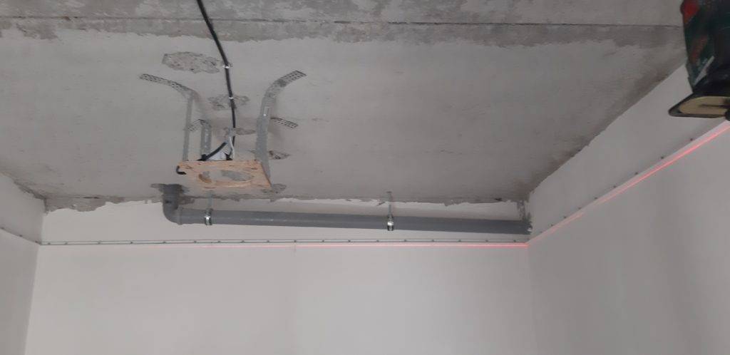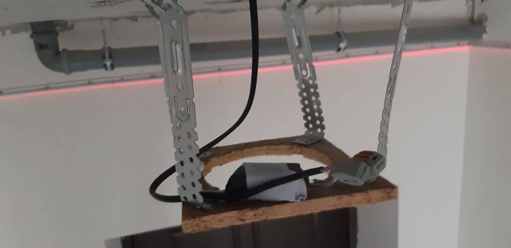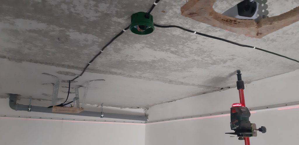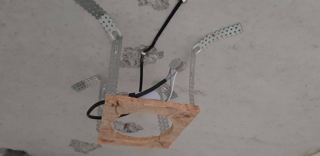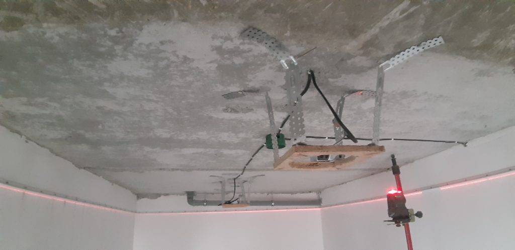 Отмечаем уровень будущего потолка и прибиваем профиль по периметру помещения. Я использовал лазерный уровень на телескопической штанге, но это не обязательно. Под светильники делаем закладные. Можно купить готовые пластиковые, но я сделал их из обрезков OSB и МДФ плит. Крепятся они на уровне профиля на обычные П-образные подвесы для гипсокартона.
