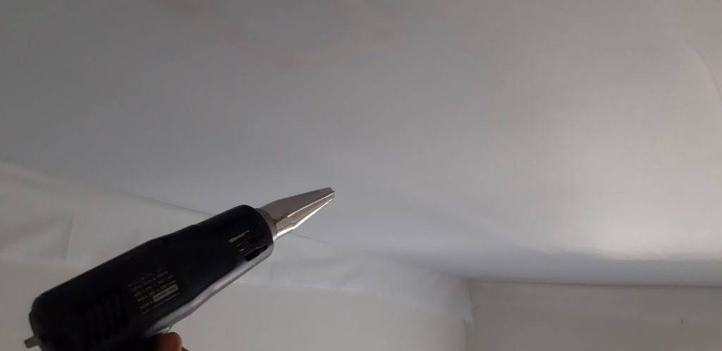 После монтажа ткани, иногда остаются небольшие складки и «помятости». Редко кто гладит утюгом ткань перед монтажом. Такие складки хорошо разглаживаются с помощью строительного или обычного домашнего фена. Главное, не перегревайте сильно ткань.