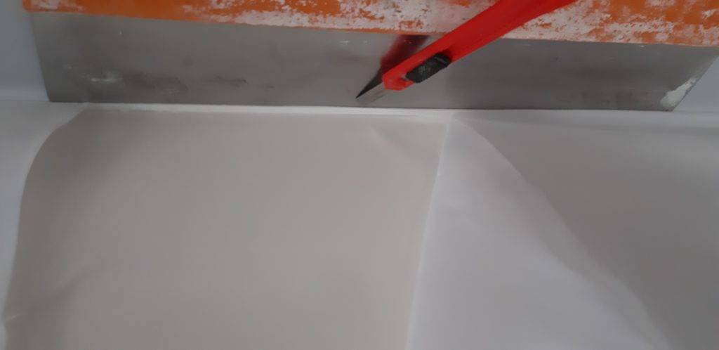 Теперь пришло время обрезать лишнюю ткань. Берем широкий шпатель и острый канцелярский нож. Приставляем к замку профиля и отрезаем лишнее от полотна.