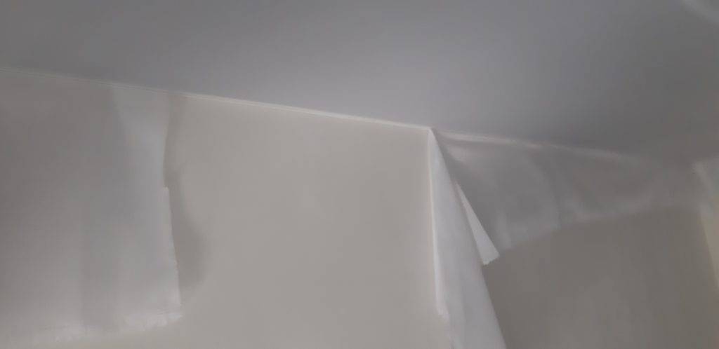 Если все прошло удачно, пройдитесь по периметру и не сильно потягивайте ткань от потолка. Надо проверить, не выскочит ли ткань из замка профиля, прочно ли она там держится. И конечно заправить ее шпателем обратно в местах, где она сидит слабо.