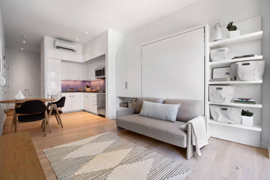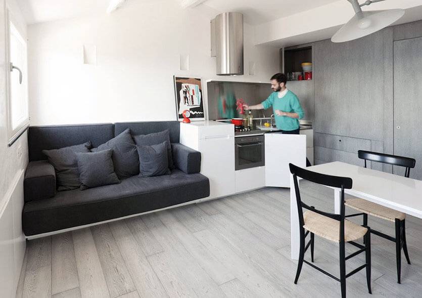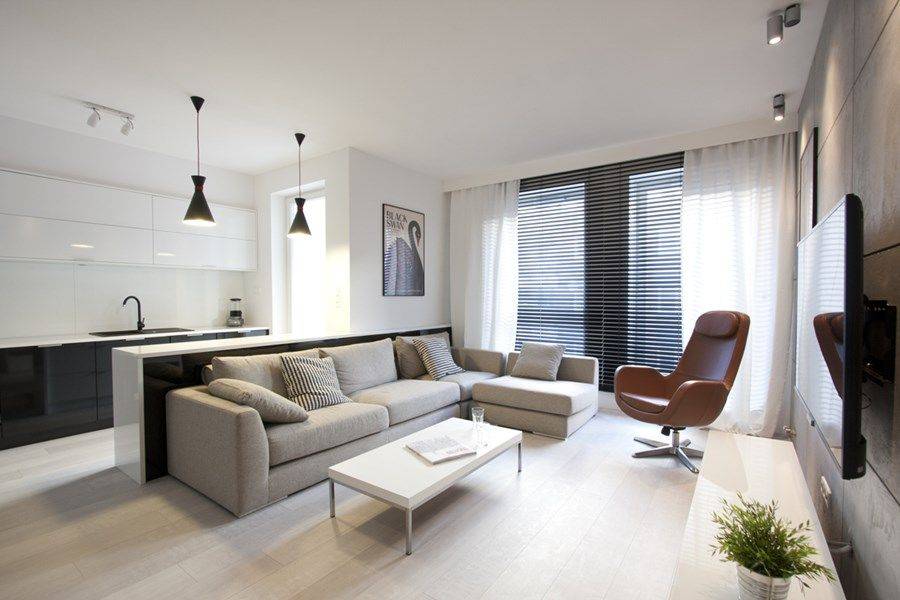 3.Если гостиная по совместительству играет роль спальни, важно обеспечить бесшумность кухонных приборов. Современная бытовая техника, к счастью, может похвастаться своей незаметностью в этом плане. Другой вариант – раздвижные двери или звукоизолирующие перегородки