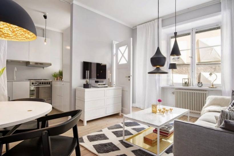 Мини-кухня с гостиной будет удобнее, если вы выберете правильное освещение. Разместите лампы под кухонными шкафами. Благодаря этому вы хорошо осветите столешницу, что облегчит приготовление блюд. Также помните о светильнике в центральной части комнаты — он позволит равномерно освещать пространство.