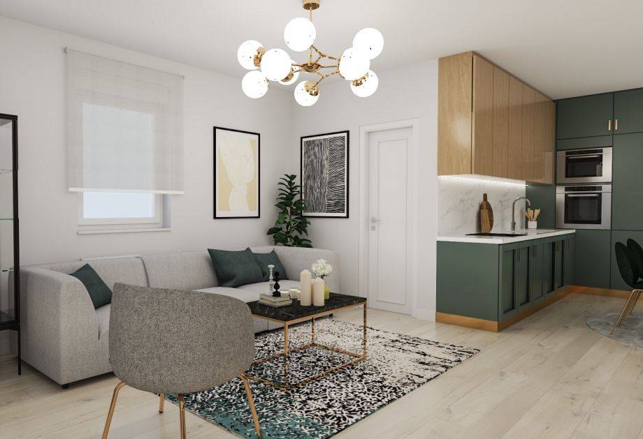Большая зона отдыха и маленькая кухня? Или, может быть, пополам, потому что вы любите готовить и вам нужно для этого достаточно места? Начать обустройство стоит с примерного разделения на зоны. Если в комнате есть ниша, дело обстоит проще — обычно именно там ставят кухонные гарнитуры со шкафчиками и навесными полками, сделанными по размеру. Однако, когда интерьер прямоугольный, нужно подумать, как его разделить. Здесь хорошо определиться, хотите ли вы выставить мебель для гостиной (красивое кресло, великолепный диван) или просто кухонную зону.