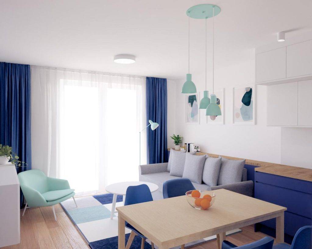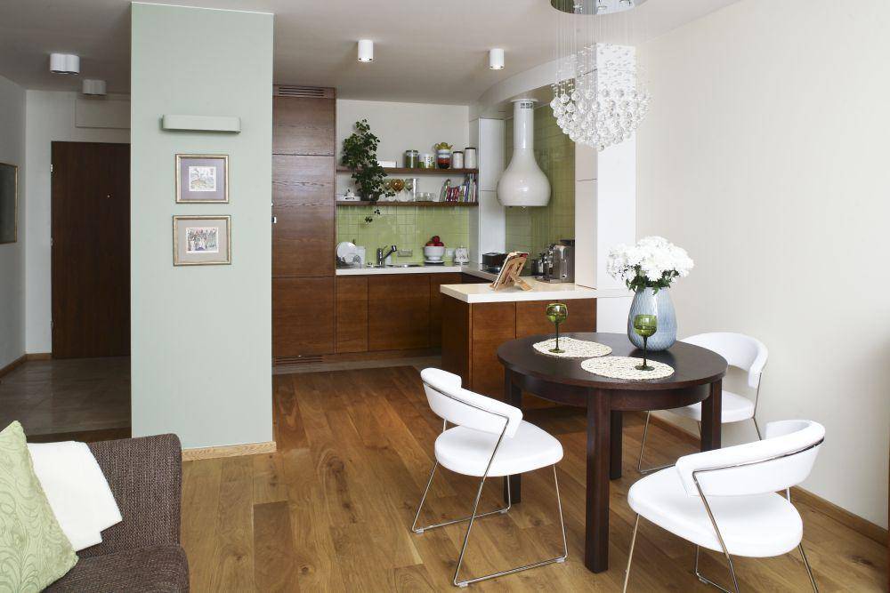 — установите раздвижные двери, которые частично ограничат вид из гостиной на кухню, — постарайтесь иметь эстетичный карниз и занавеску подобранного цвета, разделяющую две части, — установите семейный стол на границе зон (небольшая обеденная зона).