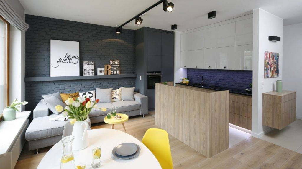 Стоит выделить разделение комнаты на зону кухни и гостиной. Это можно сделать несколькими способами, например: