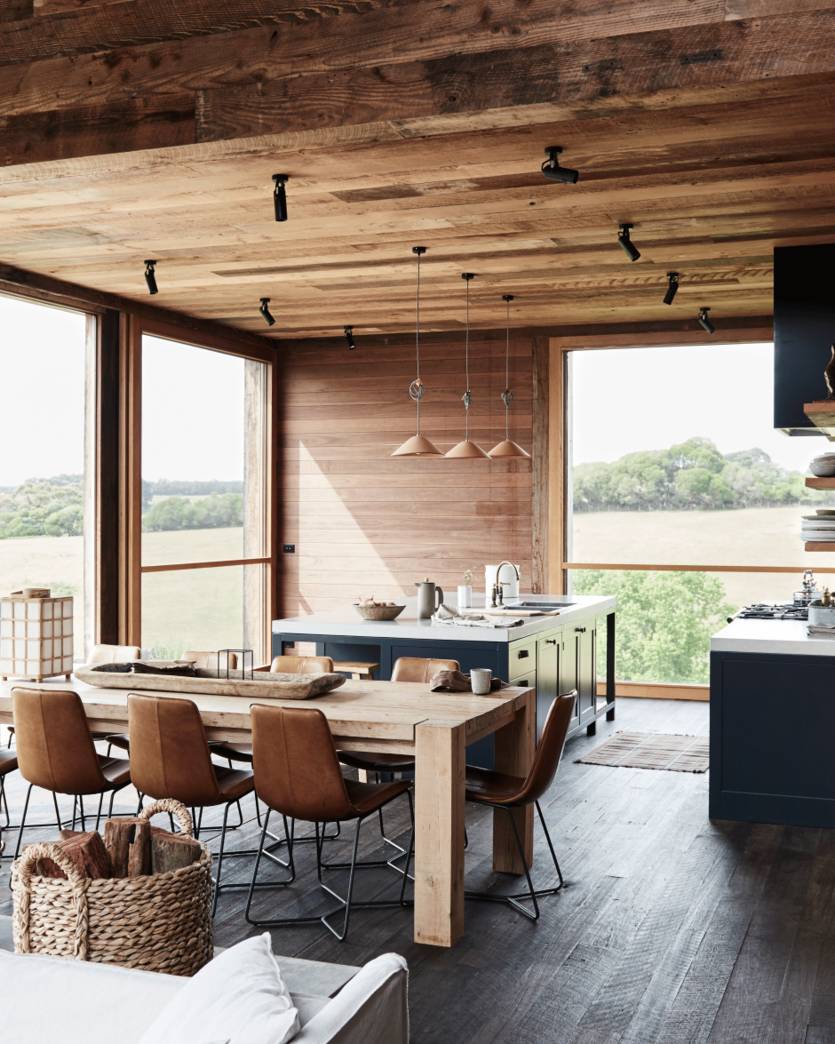 Дерево легко впитывает запахи, поэтому на кухне важно запланировать мощную вытяжку, если нужно — вытяжку дополнительную и принудительную вентиляцию. 3. В подборе текстиля и декора важно ориентироваться на пейзаж за окном с учетом сезонности
