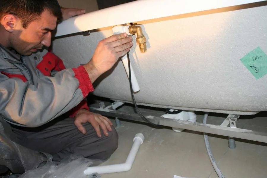 - Установите ванну на свое место и выровняйте ее. Только тогда подключите группу сифонов. Сложность процесса отражается в том, что работа должна выполняться на ощупь. Невозможно сразу увидеть с обеих сторон ванну. Но взамен сантехник имеет возможность более свободно манипулировать ванной.
