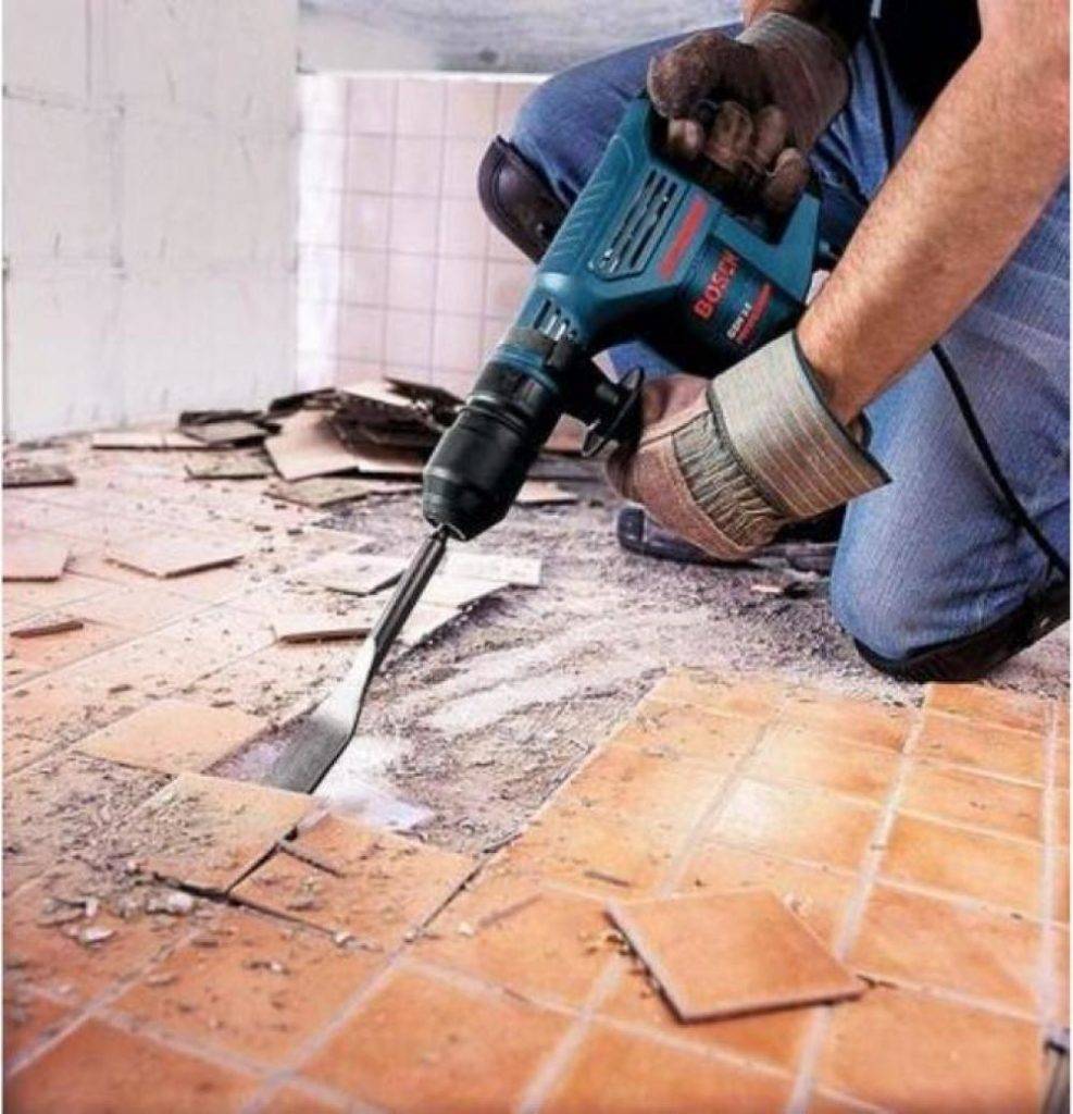 Если временные ресурсы ограничены, то в таком случае рекомендуем использовать перфоратор. Учтите, что в таком случае, плитка будет поврежденной и в помещении будет присутствовать пыль.