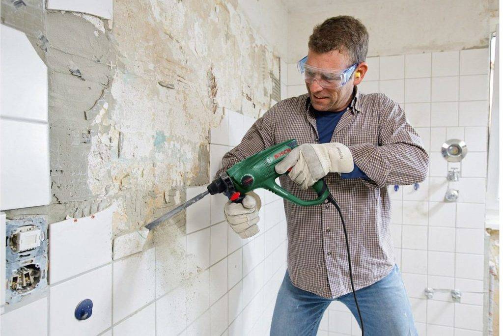 Перед тем как отбить старую плитку перфоратором, необходимо удостовериться в прочности стены и принять меры предосторожности. Отключив проводку в стенах, трубы и пол покрывают пенопластом или фанерными листами