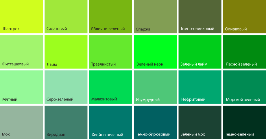 Существует около пятнадцати зеленых тонов, которые чаще всего применяются в живописи: тут есть и бледные, и яркие, и сине-зеленые оттенки. Художники знают и еще более 110 подтонов зеленого, различающихся менее значимыми нюансами. Обычно соединение зеленого с синими оттенками используется в зимних образах, а добавление желтого с образованием салатового более популярно в летних мотивах.