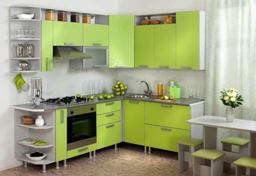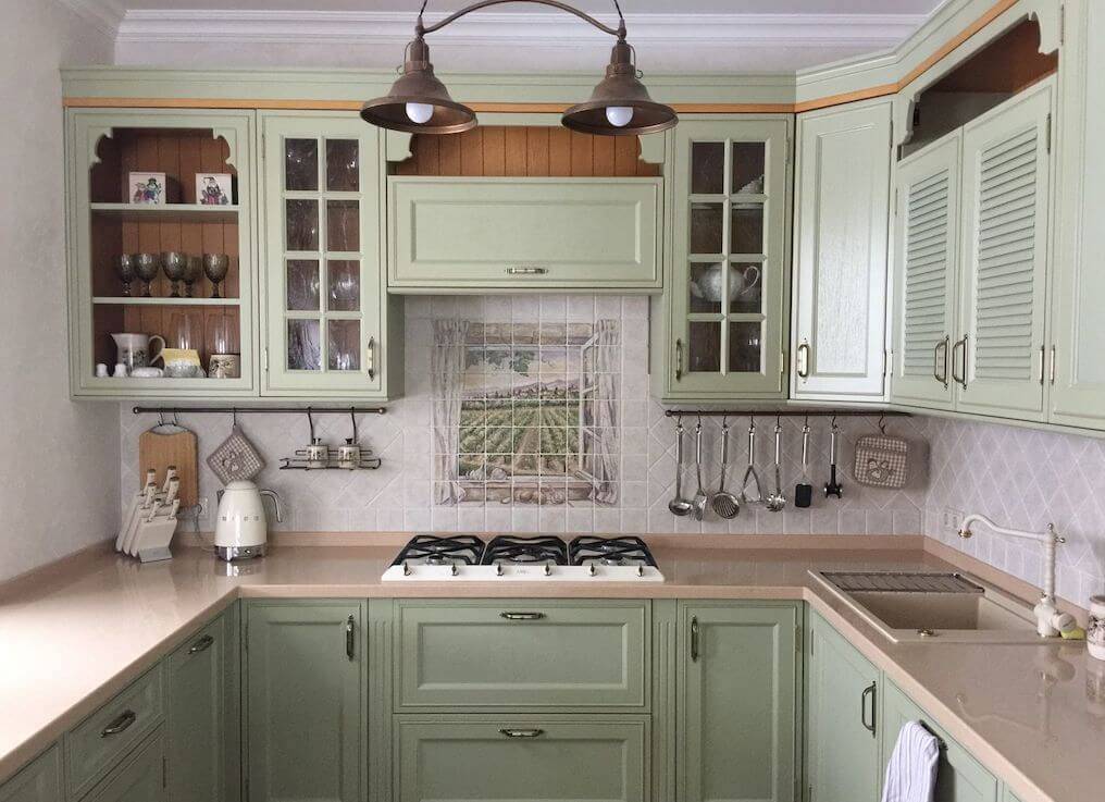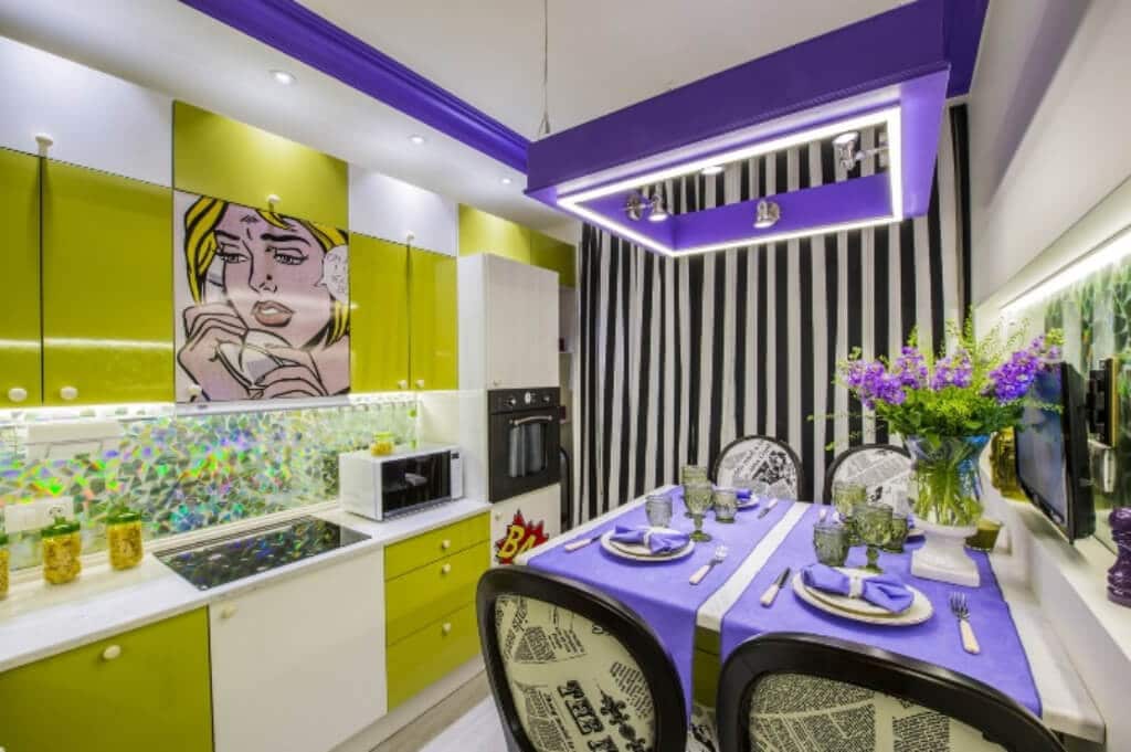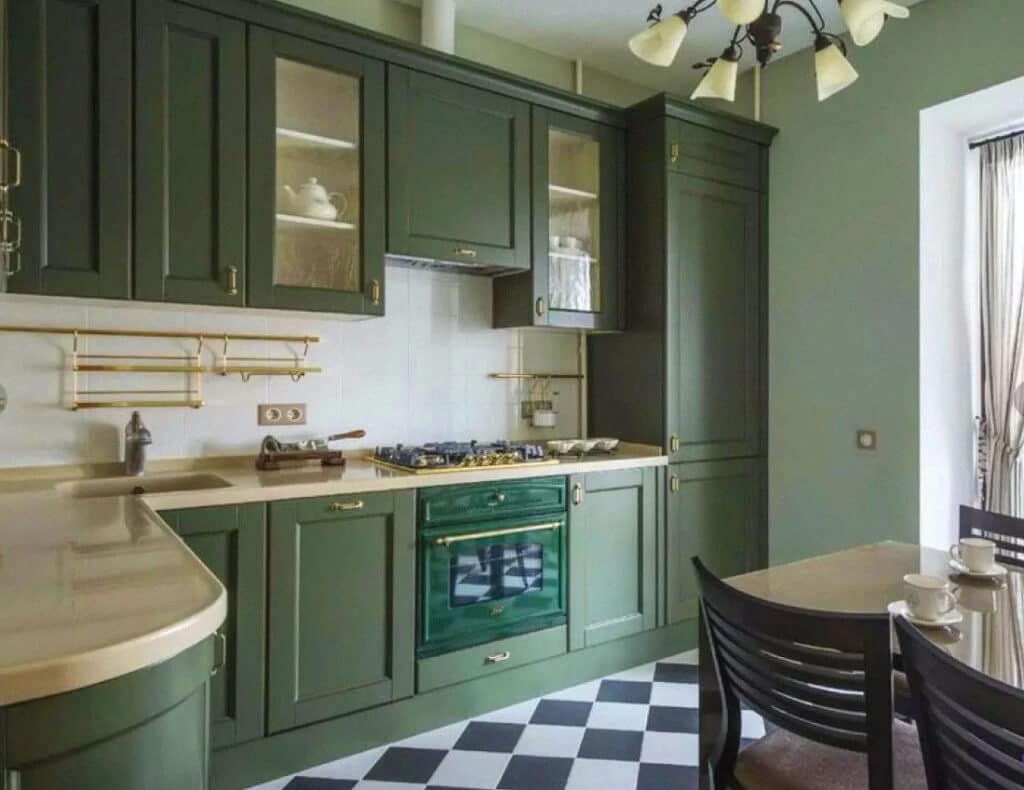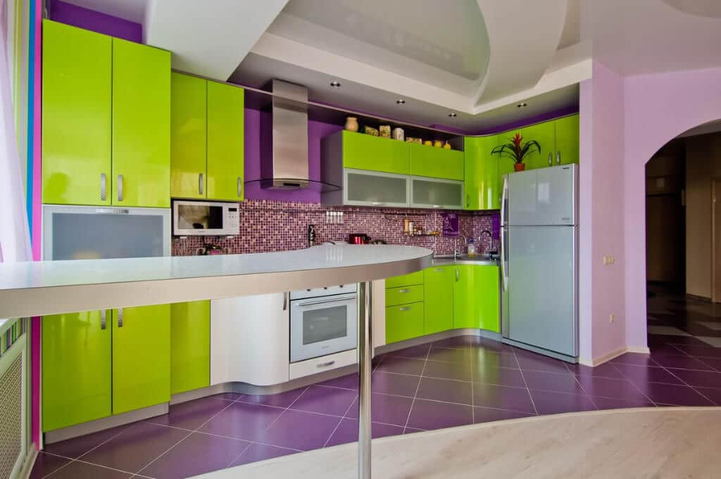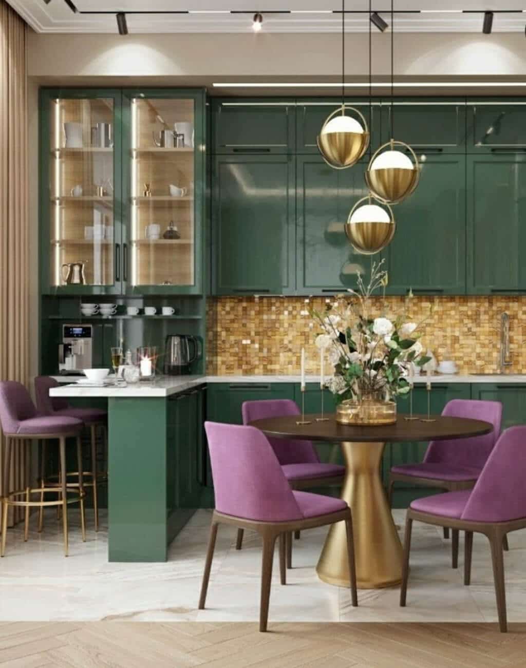 Продумывая контрастные сочетания, выбирайте холодный зеленый оттенок, если намереваетесь дополнить его холодным цветом. К примеру, для отделки изумрудной кухни подойдут сиреневый или синий.