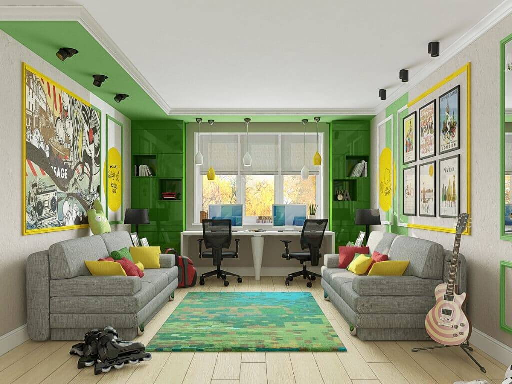 Болотный либо изумрудный оттенок может показаться ребенку чересчур мрачным и угнетающим, а такая обстановка не располагает эффективному обучению и любознательности. Если же вам такие оттенки по душе, лучше выполните в такой гамме свою спальню или кухню.