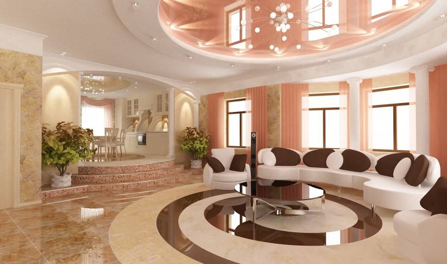 Если потолок красивый — значит, он подвесной и за ним скрывается проводка и прочие «прелести» фундамента. Связано это с тем, что в наше время ставится задача получения эстетичной композиции при минимальных временных, трудовых и денежных затратах.