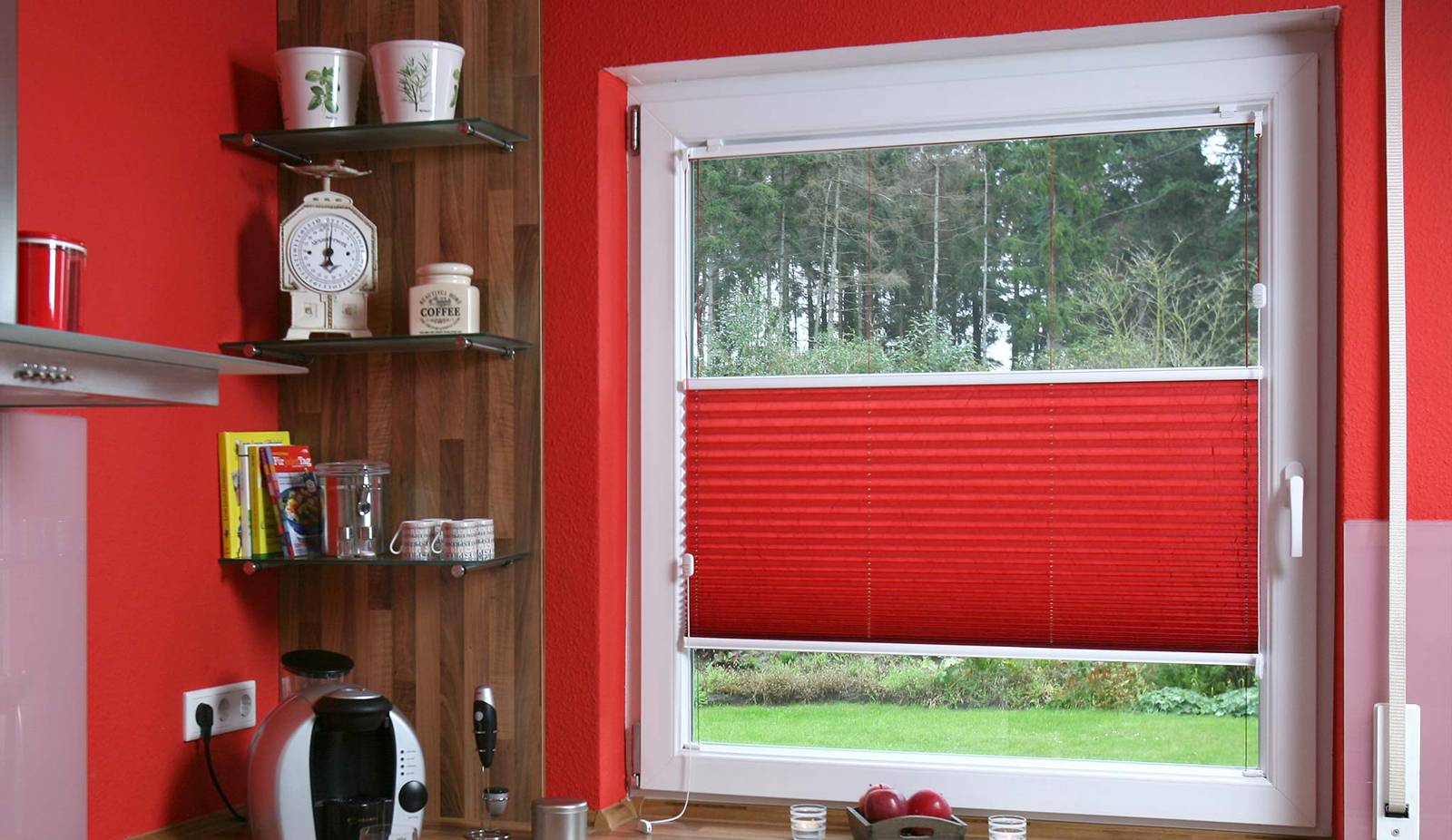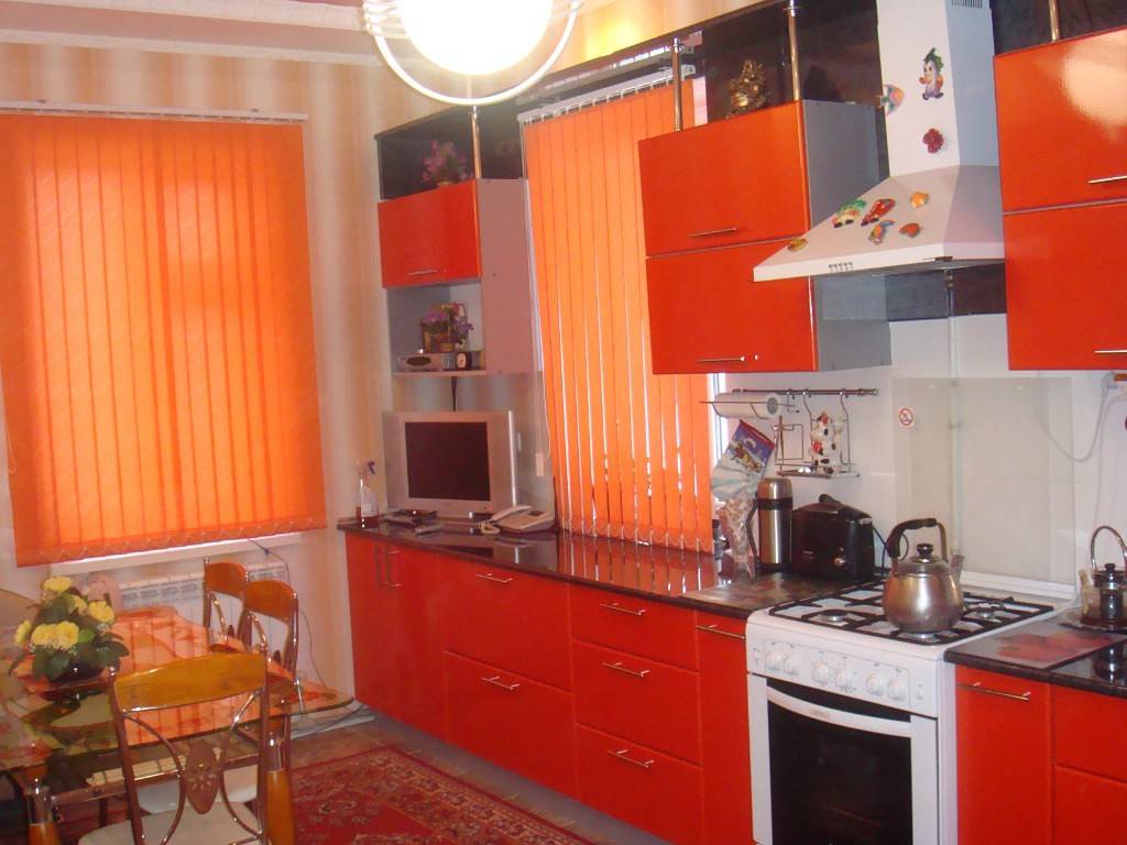 Красные жалюзи являются сильной доминантой. В кухне они должны сочетаться еще с какими-нибудь элементами интерьера красного цвета: например, с фартуком или с текстилем.