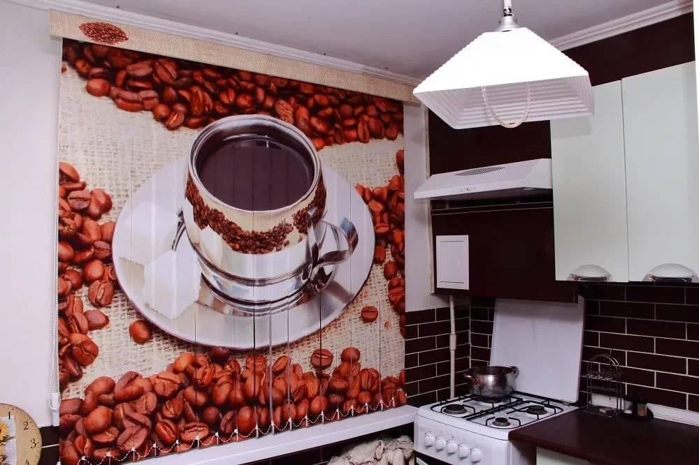 Идеальным вариантом оформления кухни будет заказ жалюзи с фотопечатью с сюжетом повторяющимся, например, на кухонном фартуке. Тогда вы получите действительно индивидуальный дизайн.
