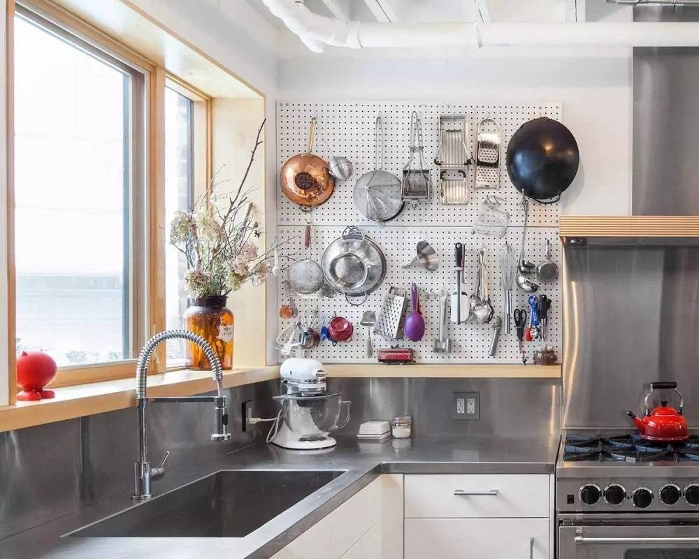 Удобная фишка для хранения кухонных девайсов — перфорированная панель на стену. На нее легко подвешивать любой кухонный инвентарь — от поварешек до небольших сковородок.